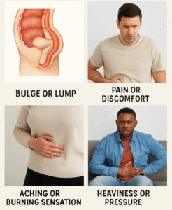 - Visible Swelling: A noticeable bulge may appear when standing, coughing, or straining, and often disappears when lying down.