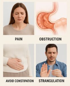 - Severe Symptoms: Obstruction may cause severe abdominal pain, nausea, vomiting, and inability to pass stool or gas.